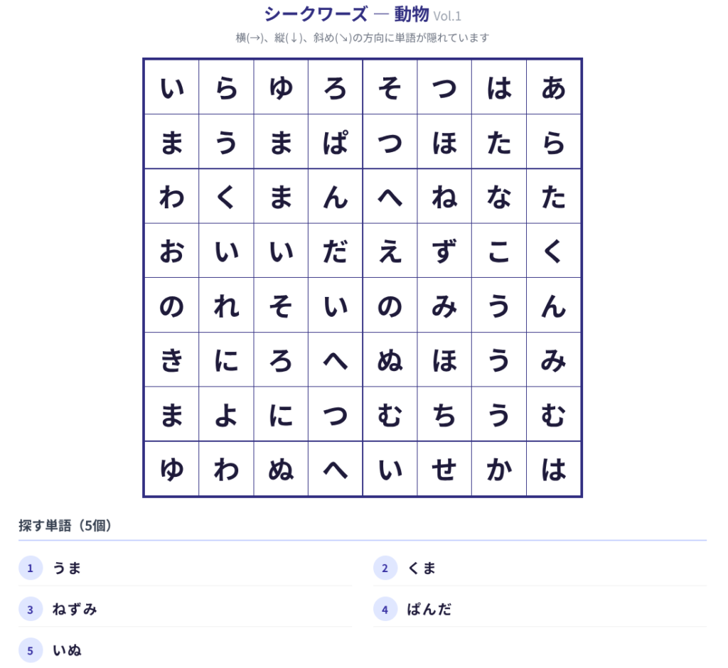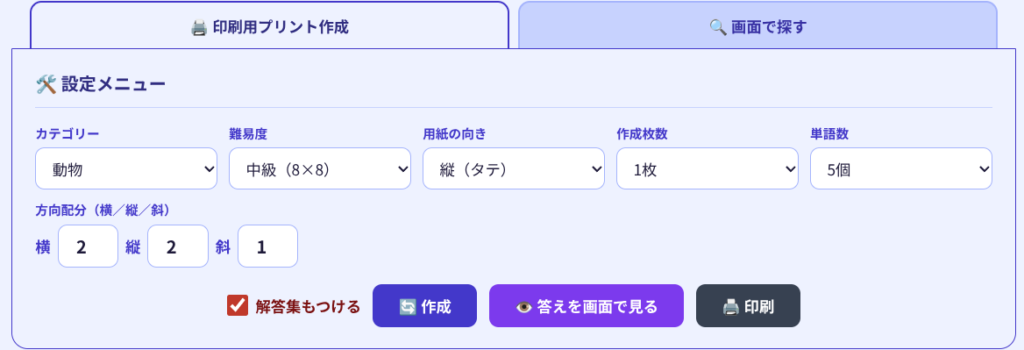 - 特徴3:A4サイズにぴったり!美しいプリントと「解答集」の自動生成 もちろん、高齢者に馴染み深い「紙に印刷して鉛筆で探す」スタイルにも完全対応しています。PCの「印刷」ボタンを押せば、不要な設定パネルは自動で消え、目に優しい大きな文字でレイアウトされた高品質なA4プリントが完成します。同時に「解答集」も生成されるため、病棟の看護師さんやご家族に丸付けをお願いする際の手間も一切かかりません。