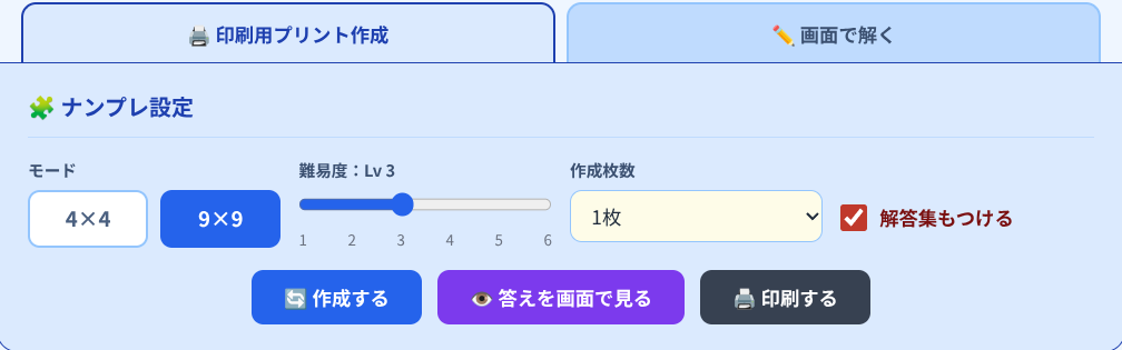 そんな現場の悩みを一掃するため、私が独自開発した「リハビリ用ナンプレ作成ツール」を大幅にアップデートしました! これまでの「A4プリント一括作成機能」に加え、タブレットやスマホでそのまま解ける**「画面で解くモード(インタラクティブモード)」と、一瞬で正誤を判定する「自動採点機能」**を新搭載しました。